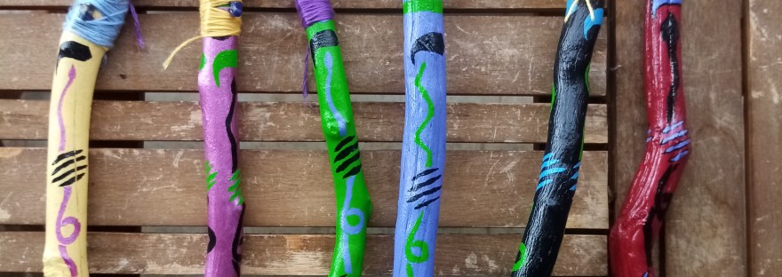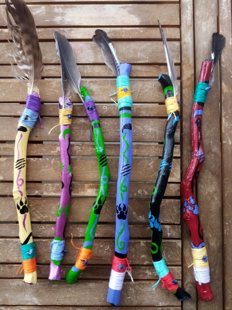 🪶 Des Bâtons rituels de Pouvoir Animaux Totems (10€), associés aux esprits du loup, de l’ours, de l’Aigle et du Serpent, avec une plume de Geai et des cristaux de Lapis-Lazulis.