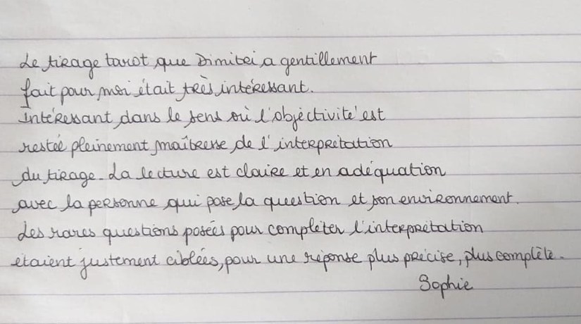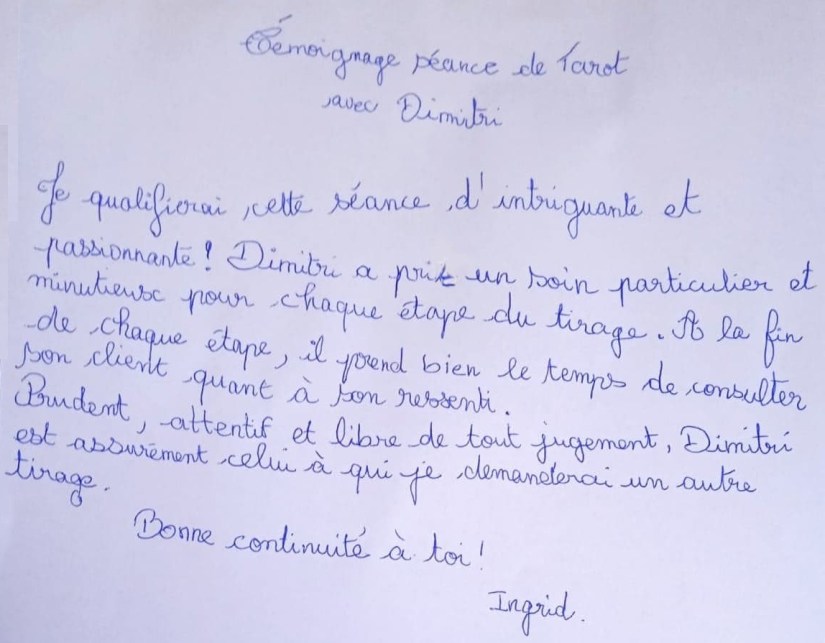 « Le tirage tarot que Dimitri a gentiment fait pour moi était très intéressant. Intéressant dans le sens où l’objectivité est restée pleinement maîtresse de l’interprétation du tirage. La lecture est claire et en adéquation avec la personne qui pose la question et son environnement. Mes rares questions posées pour compléter l’interprétation étaient justement ciblées, pour une réponse plus précise, plus complète »🌺