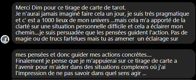 🌈 »Merci Dim pour ce tirage de carte de tarot. Je n’aurai jamais imaginé faire cela un jour, je suis très pragmatique et c’est à 1000 lieux de mon univers …mais cela m’a apporté de la clarté sur une situation personnelle difficile et cela a éclairé mon chemin… je suis persuadée que les pensées guident l’action. Pas de magie ou de trucs farfelues mais tu as amené un éclairage sur mes pensées et donc guidé mes actions concrètes… Finalement je pense que je m’appuierai sur ce tirage de carte à l’avenir pour m’aider dans des situations complexes où j’ai l’impression de ne pas savoir dans quel sens agir … »🌻