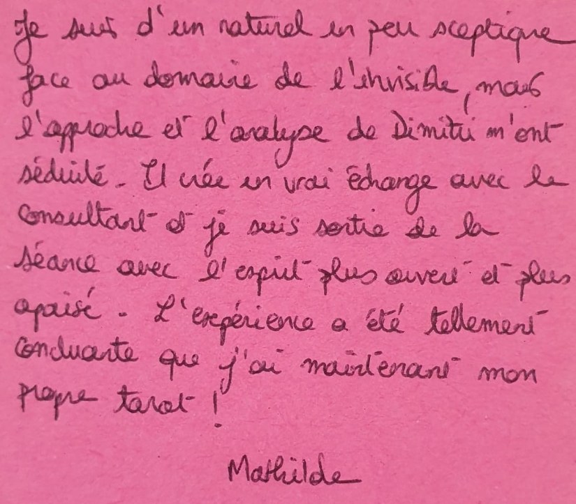 🧡« Je suis d’un naturel un peu sceptique face au domaine de l’invisible, mais l’approche et l’analyse de Dimitri m’ont séduite. Il crée un vrai échange avec le consultant et je suis sortie de la séance avec l’esprit plus ouvert et plus apaisé. L’expérience a été tellement concluante que j’ai maintenant mon propre tarot ! »🍃