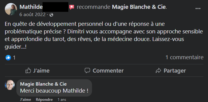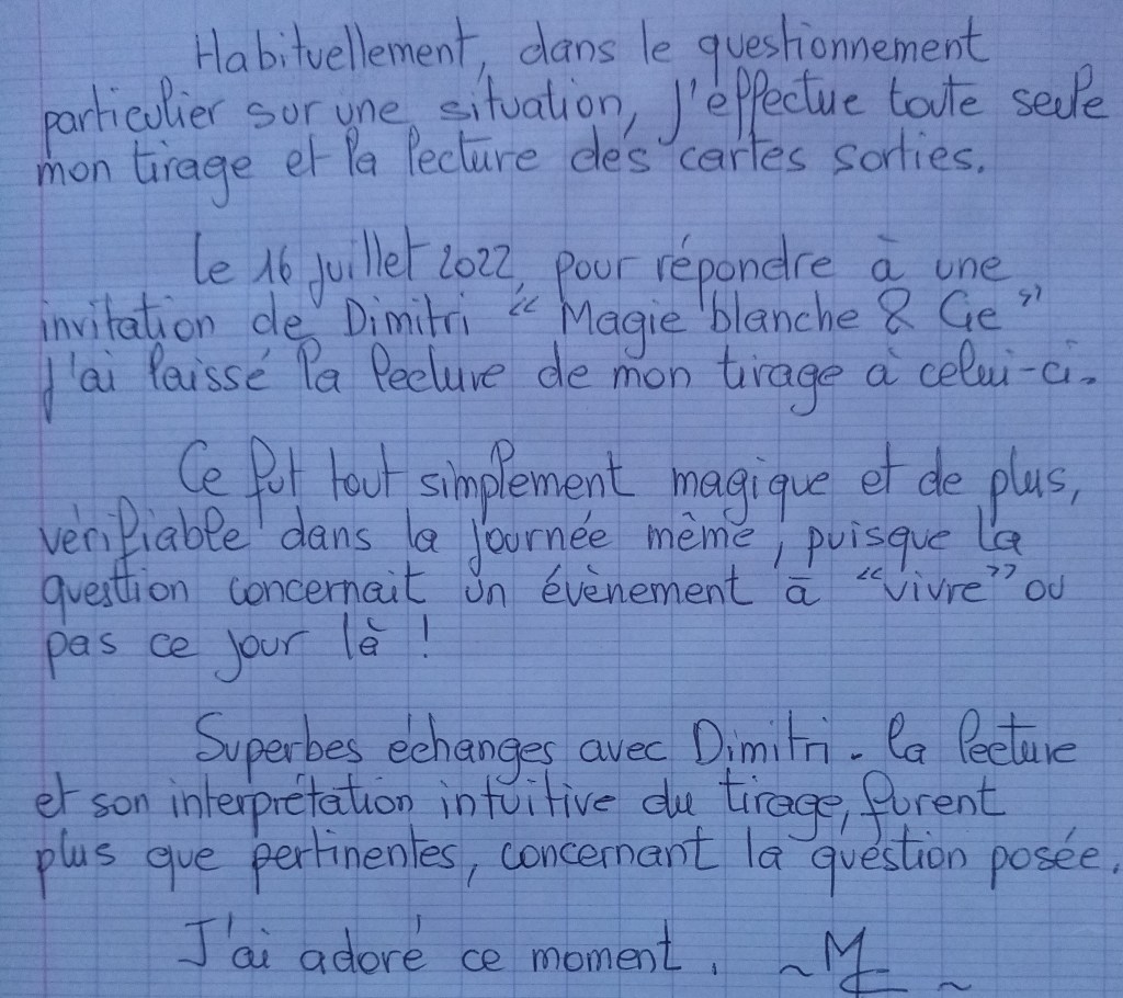 🌼 »Habituellement, dans le questionnement particulier sur une situation, j’effectue seule mon tirage et la lecture des cartes sorties. Le 16 Juillet 2022, pour répondre à une invitation de Dimitri « Magie Blanche Cie », j’ai laissé la lecture de mon tirage à celui-ci. Ce fut tout simplement magique et de plus vérifiable dans la journée même, puisque la question concernait un évènement à « vivre » ou pas ce jour là ! Superbes échanges avec Dimitri. La lecture et son interprétation intuitive du tirage furent plus que pertinentes, concernant la question posée. J’ai adoré ce moment. »🌘