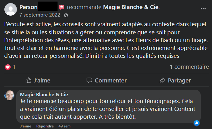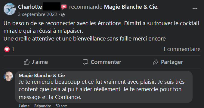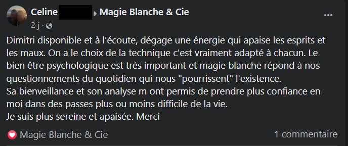🌿 »Dimitri disponible et à l‘écoute, dégage une énergie qui apaise les esprits et les maux. On a le choix de la technique, c’est vraiment adapté à chaun. Le bien être psychologique est très important et Magie Blanche répond à nos questionnements du quotidien qui nous « pourrissent » l’existence. Sa bienveillance et son analyse m’ont permis de prendre plus confiance en moi dans des passes plus ou moins difficile de la vie. Je suis plus sereine et plus apaisée. merci »🧘♂️