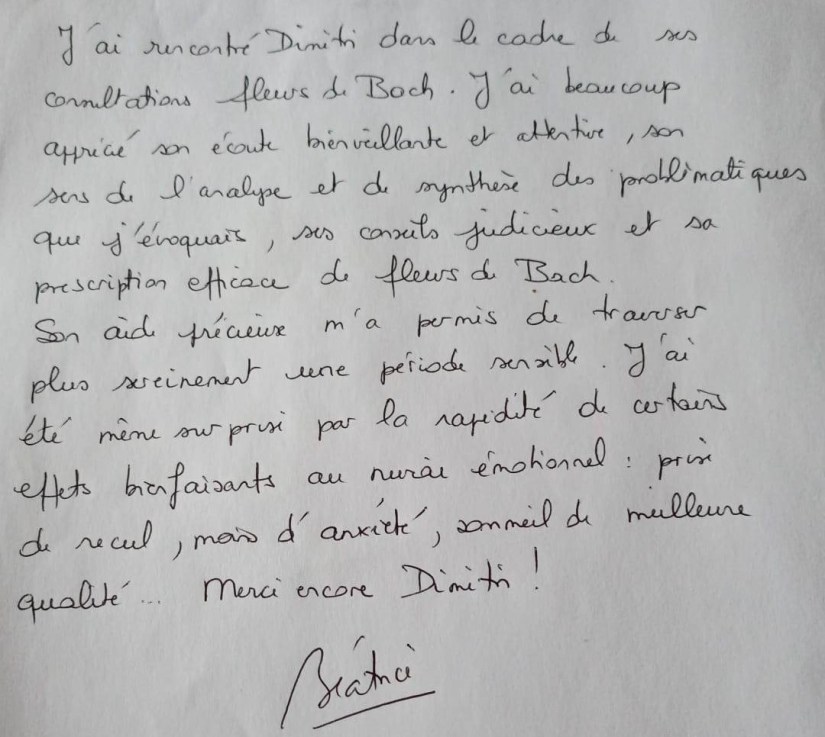 🌷 »J’ai rencontré Dimitri dans le cadre de ses consultations fleurs de Bach. J’ai beaucoup apprécié son écoute bienveillante et attentive, son sens de l’analyse et de synthèse des problématiques que j’évoquais, ses conseils judicieux et sa prescription efficace de fleurs de Bach. Son aide précieuse m’a permis de traverser plus sereinement une période sensible. j’ai été même surprise par la rapidité de certains effets bienfaisants au niveau émotionnel : prise de recul, moins d’anxiété, sommeil de meilleur qualité. Merci encore Dimitri ! »🪶