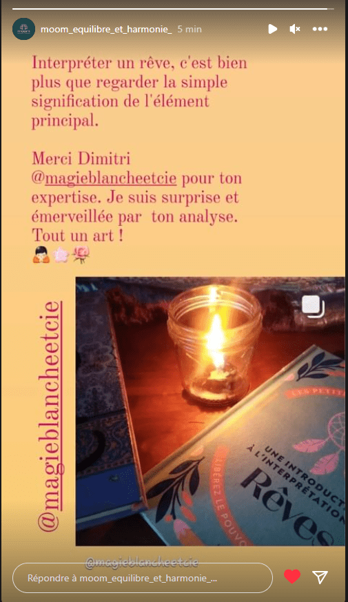 🍧 »Un grand merci Dimitri pour notre discussion sur mon rêve/cauchemar ! J’ai beaucoup aimé l’approche très factuelle et ta lecture très juste ! Depuis je suis beaucoup plus apaisée et j’ai envie d’en apprendre plus sur tout ça. Les mots ne sont pas assez forts mais du fond du coeur un grand merci. Je recommande Dimitri les yeux fermés. »💚
