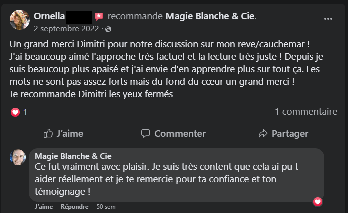 💜 « Pour la première fois que j’ai partagé l’un de mes rêves en toute sérénité, ce fut avec Dimitri. Par ses analyses fines du rêve et de ses caractéristiques, par ses questions, Dimitri a su m’amener à réfléchir et exprimer mes émotions liées à ce rêve. Son interprétation a su m’amener à prendre du recul sur le rêve et ses liens avec un évènement ou une expérience passée. En toute objectivité et avec bienveillance, Dimitri a mis à ma disposition plusieurs lectures symboliques de ce rêve. Je suis ressortie grandie de cette interprétation et j’ai hâte de renouveler l’expérience. »🌷